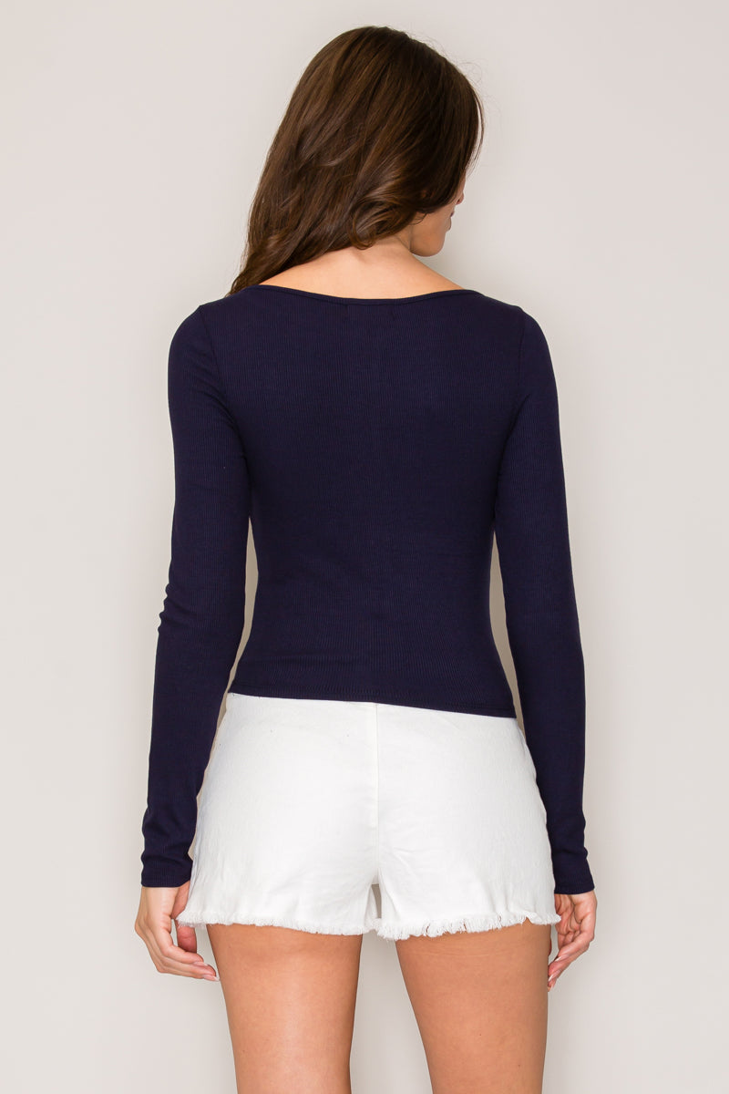 Ribbed Boat Neck Button Down Long Sleeve Top